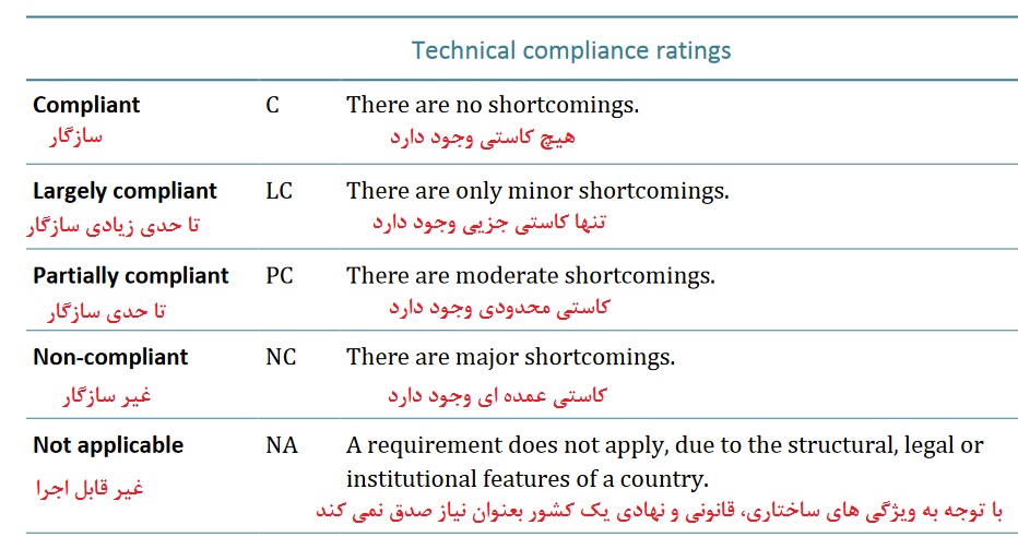 1) واژه ای که در تعریف حالت Non-compliant (NC) (حالتی که تا سه ماه پیش بوده ایم) آمده، "کاستی عمده ای وجود دارد" است. در سند FATF واژه Full shortcomings (کاستی کامل) نیامده است بلکه واژه major shortcomings آمده است.